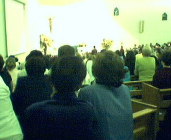 viram um anjo em uma das fotos e Cristo na outra. The following 2 photos were taken by Rene Schmitt during Ivan's 2003 visit to St.Vincent's Church, Surfers Paradise. Ivan is at the front, kneeling during the apparition. The extra light on the altar shown during the photo is not normally visible. Also the Crucifix is also shown differently. Some people can see an angel in one and Christ in the other. Retirado do site Australia Medjugorje |
