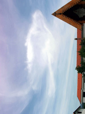 Silhueta em nuvens em cima da capela de adoração em Medjugorje