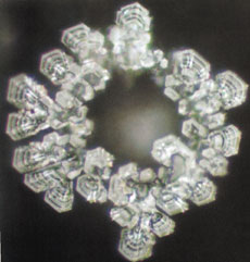 | Cristal de água congelada da fonte de Lourdes | Cristal de água destilada congelada |