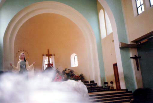 Foto tirada em 1994 por padre italiano dentro da igreja de Medjugorje mostrando uma nuvem embaixo da estátua da Rainha da Paz |