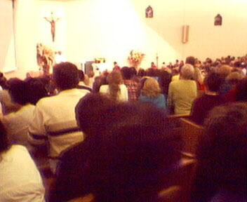 viram um anjo em uma das fotos e Cristo na outra. The following 2 photos were taken by Rene Schmitt during Ivan's 2003 visit to St.Vincent's Church, Surfers Paradise. Ivan is at the front, kneeling during the apparition. The extra light on the altar shown during the photo is not normally visible. Also the Crucifix is also shown differently. Some people can see an angel in one and Christ in the other. Retirado do site Australia Medjugorje |