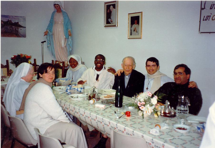 Fig 21-O abade René Laurentin com o nosso fundador Pe.Gianni e irmãos da comunidade,na casa geral em passo corese(Roma).